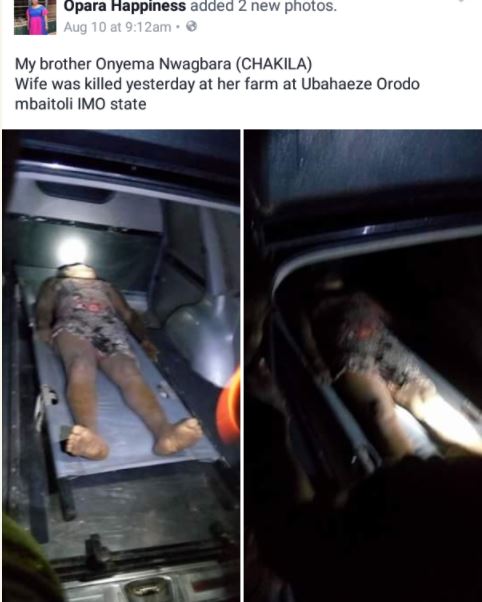 She wrote: "My brother Onyema Nwagbara (CHAKILA). Wife was killed yesterday at her farm at Ubahaeze Orodo mbaitoli IMO state."